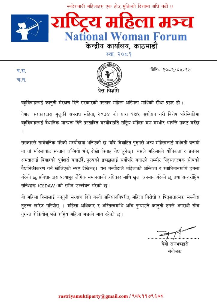 नेपाल सरकारले मुलुकी अपराध संहिता २०७४ को धारा १७५ संशोधन गरी विशेष परिस्थितिमा बहुविवाहलाई कानुनी मान्यता दिने प्रस्ताव अघि सारेको छ। नेपाल सरकारको यो प्रस्ताव प्रति राष्ट्रिय मुक्ति पार्टी निकट राष्ट्रिय महिला मञ्चले गम्भीर आपत्ति जनाएको छ । मञ्चका संयोजक बेवीराज भण्डारीले एक विज्ञप्ति जारी गर्दै प्रस्तावित मस्यौदाले महिलाको अस्मिता, अस्तित्व र अधिकारमाथि सीधा प्रहार गरेको आरोप लगाउनु भएको छ । नेपाल सरकारद्वारा मुलुकी अपराध संहिता, २०७४ को धारा १७५ संशोधन गरी विशेष परिस्थितिमा बहुविवाहलाई वैधानिक मान्यता दिने प्रस्तावित मस्यौदाप्रति मञ्च गम्भीर आपत्ति प्रकट गरेको छ । यस मस्यौदाले महिलाको अस्तित्व र स्वाभिमानमाथि हमला गरेको छ, संविधानद्वारा प्रत्याभूत लैंगिक समानताको अधिकार माथि खुला अपमान गरेको छ, तथा अन्तर्राष्ट्रिय सन्धिहरू (CEDAW) को समेत उल्लंघन गरेको हुनाले तुरुन्त खारेज गर्न मंचले माग गरेको छ ।